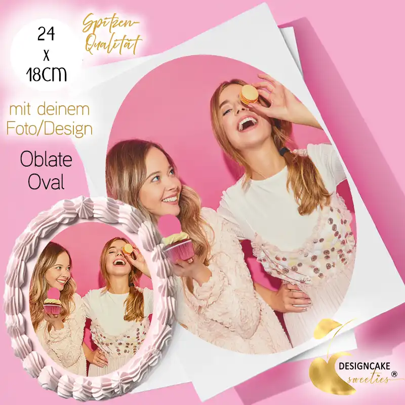 Verleihen Sie Ihren Torten, Desserts oder Eisbechern eine persönliche Note! Unsere bedruckte ovale Oblate in Spitzenqualität wird individuell nach Ihren Wünschen gestaltet – ob mit Firmenlogo, Foto oder eigenem Motivdesign.