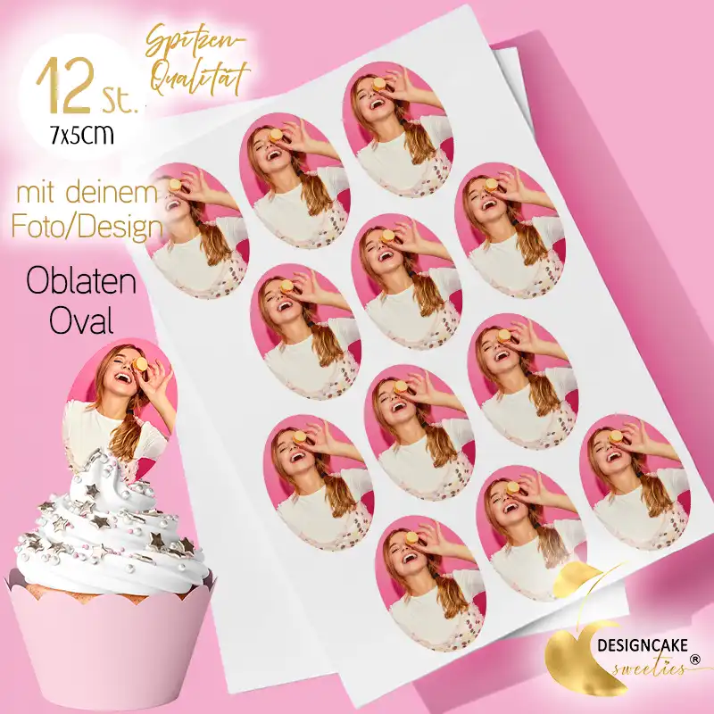Gestalten Sie Ihre ovalen Oblaten ganz nach Wunsch: Laden Sie Ihr Logo, Foto oder Design direkt bei der Bestellung hoch oder senden Sie es per E-Mail. Wir übernehmen den Rest – vom lebensmittelechten Druck bis zur präzisen Stanzung. Ihre 12 ovalen Oblaten in der Größe 7 × 5 cm kommen fix und fertig zugeschnitten zu Ihnen – in Spitzenqualität, hergestellt aus feinsten Zutaten.