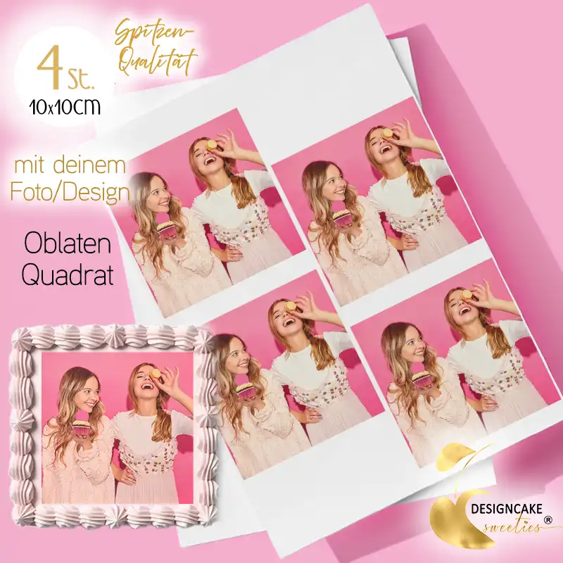 Verleihen Sie Ihren Torten, Desserts oder Eisbechern eine persönliche Note! Unsere bedruckten quadratischen Oblaten in Spitzenqualität werden individuell nach Ihren Wünschen gestaltet – ob mit Firmenlogo, Foto oder eigenem Motivdesign.