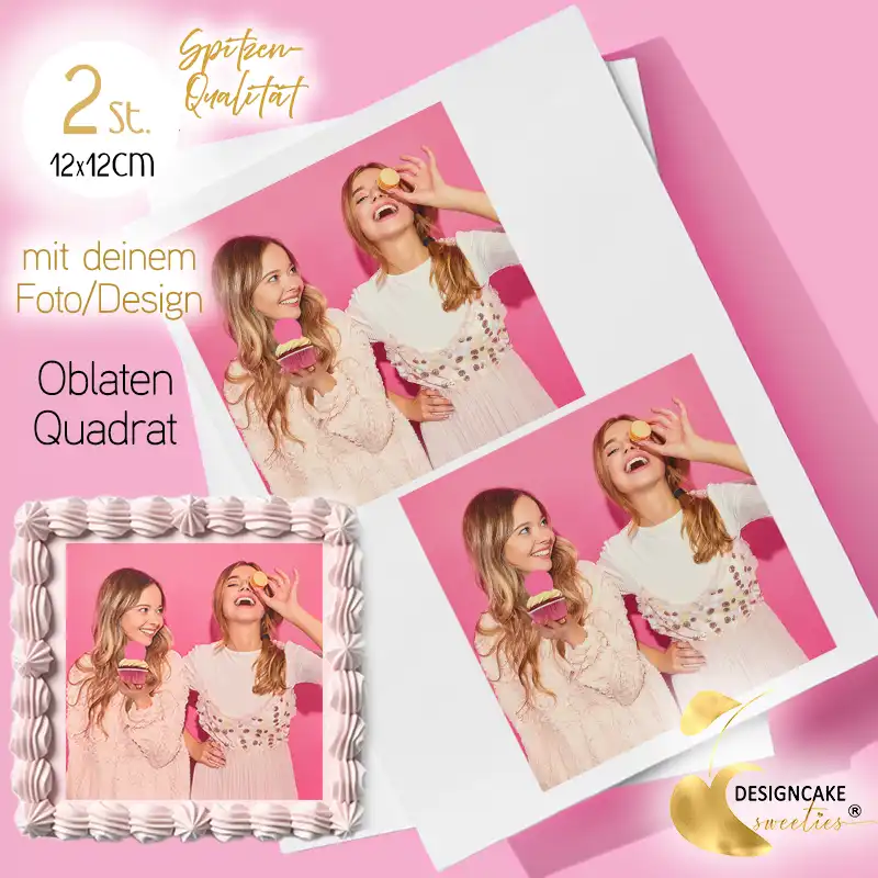 Gestalten Sie Ihre quadratischen Oblaten ganz nach Wunsch: Laden Sie Ihr Logo, Foto oder Design direkt bei der Bestellung hoch oder senden Sie es per E-Mail. Wir übernehmen den Rest – vom lebensmittelechten Druck bis zur präzisen Stanzung. Ihre 2 quadratischen Oblaten in der Größe 12 × 12 cm kommen fix und fertig zugeschnitten zu Ihnen – in Spitzenqualität, hergestellt aus feinsten Zutaten.