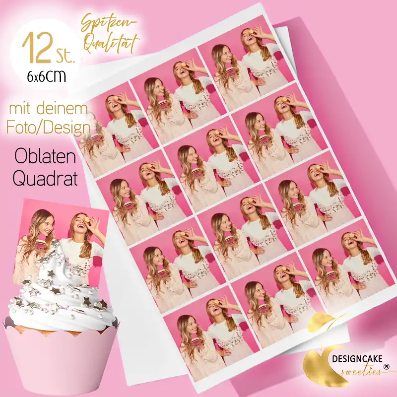 Gestalten Sie Ihre quadratischen Oblaten ganz nach Wunsch: Laden Sie Ihr Logo, Foto oder Design direkt bei der Bestellung hoch oder senden Sie es per E-Mail. Wir übernehmen den Rest – vom lebensmittelechten Druck bis zur präzisen Stanzung. Ihre 12 quadratischen Oblaten in der Größe 6 × 6 cm kommen fix und fertig zugeschnitten zu Ihnen – in Spitzenqualität, hergestellt aus feinsten Zutaten.