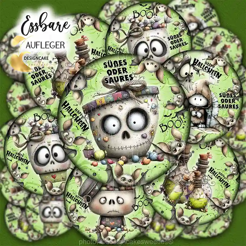 essbaren Toppers für Muffins, Cupcakes oder Kekse, die jedem das Wasser im Mund zusammenlaufen lassen. Unsere essbaren Aufleger wirken wie ein magischer Zaubertrank für deine Köstlichkeiten und bringen die perfekte Halloween-Atmosphäre in deine Desserts!